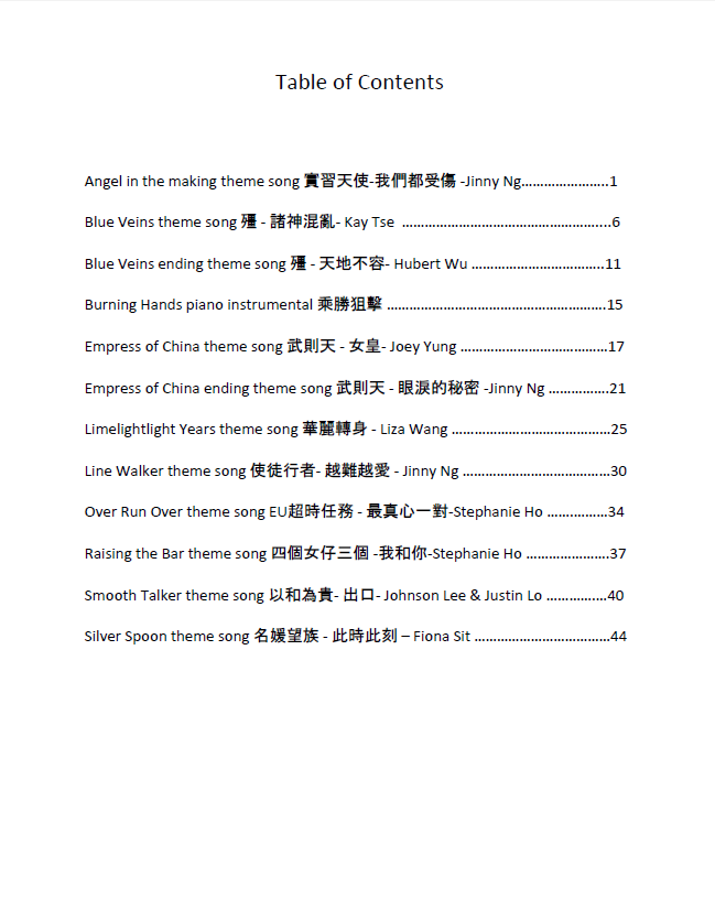 A compilation of piano sheets for 12 TVB Drama Theme and Sub-Theme Songs